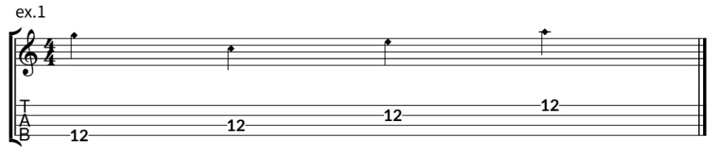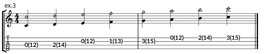 親指が加わるパターン。①弦は上記と同じ。③弦は親指で鳴らします。