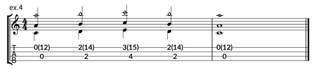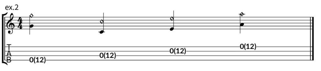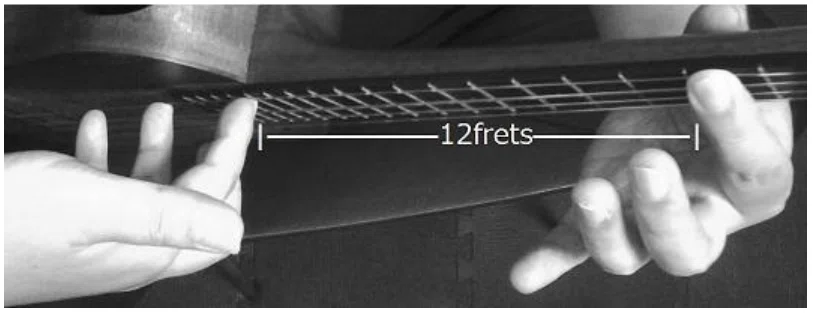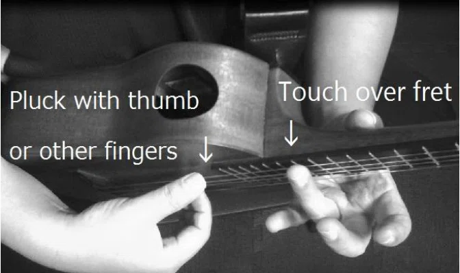 左手で指定された弦のフレットを押さえた状態でその弦の12フレット上の フレット をライトハンドハーモニクスと同様に右手人差し指で指定フレットに軽く触れ薬指で弦を弾きます。