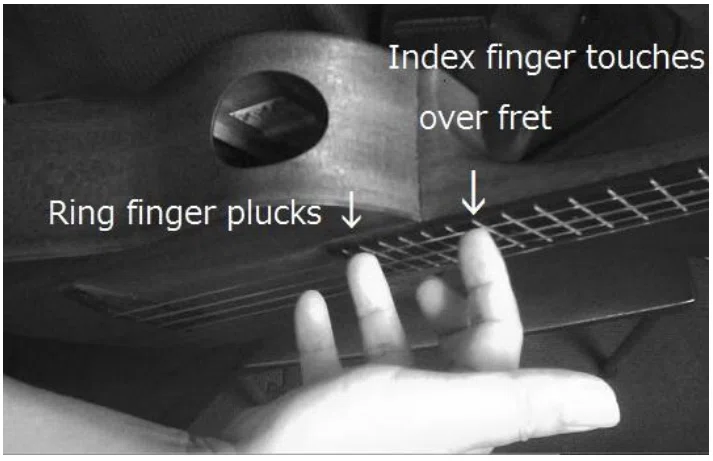 ナチュラルハーモニクスを右手だけで鳴らします。指定された弦のフレットを 右手人差し指で軽く触れ薬指で弦を弾きます。人差し指で指定フレットに触れて親指で弾く奏法もありますが今回は使用しません。